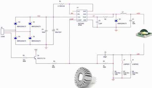 另一方面,如上所述,在不需要隔離的應用中,可以采用較為簡單的降壓拓撲結構,這種結構所使用的電感比變壓器小得多,而且只需要很少的元件來實現這種解決方案。這種架構采用的是峰值電流控制(PCC)模式,工作在深度連續導電模式(CCM)。這種架構具有多種優勢,如可以消除使用大電解輸出電容、具有“良好”穩流的簡單控制原理,以及能夠充分利用安森美半導體的動態自供電(DSS)技術能力來直接從交流線路為驅動器供電。圖3顯示的是安森美半導體NCP1216 PWM電流模式控制器的應用設計示意圖。