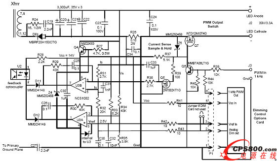 隨著LED在性能及成本幾乎各個方面的持續改進,LED照明正在用于越來越寬的應用領域,其中LED街燈就是業界關注的一個焦點。安森美半導體身為應用于高能效電子產品的首要高性能硅方案供應商,針對各類LED照明應用提供豐富的驅動器、穩壓器/穩流器,及通信、光傳感器、MOSFET、整流器、保護、濾波器及熱管理產品等完整方案。本文將介紹一款用于LED街燈等應用的28 V、3.3 A的離線高功率因數LED驅動器設計。這設計基于安森美半導體的NCL30001 LED驅動器及NCS1002恒壓恒流控制器,采用90至265 V交流電壓供電,提供最大90 W的輸出功率,具有高功率因數,同時符合相關諧波含量標準,并能夠配合脈寬調制(PWM)調光。