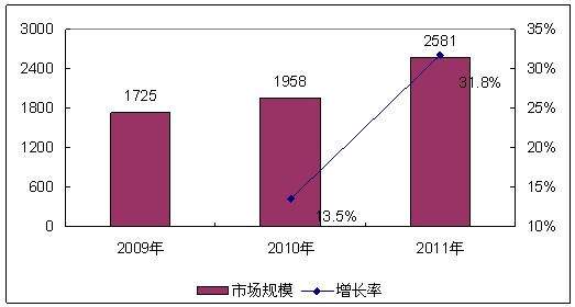 2009年以來,我國物聯網發展迅速,并逐步上升為國家戰略。我國的物聯網政策環境不斷改善,在政策導向及外圍市場的促使下,標準示范園建設項目顯著增多,市場規模快速增長,2011年,我國物聯網產業規模達到2581億元,同比增長35.1%。