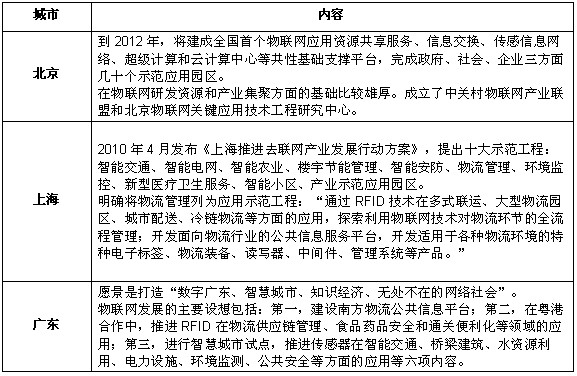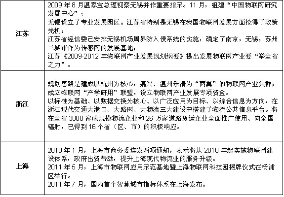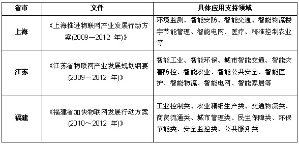 此外,除中央政策外,地方政府也根據當地產業狀況制定了具體的產業扶持計劃。如上海市于2010年4 月印發《上海推進物聯網產業發展行動方案(2009—2012 年)》(滬經信辦(2010)162 號),重點支持智能交通、物流管理、智能安防等子產業。
