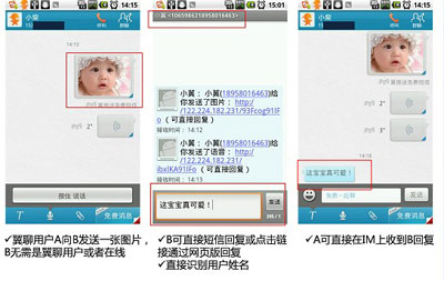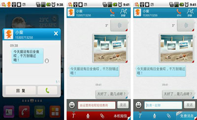 好友突然發(fā)來的一條短信,讓筆者有了新的發(fā)現(xiàn),隨著一聲清脆的自行車鈴聲提示,手機上短信窗口躍出桌面,赫然是好友剛給我發(fā)來的短信。短信窗口與iPhone桌面短信有些類似,隨手點擊回復,跳轉到翼聊消息對話框界面。原來,翼聊"超越版"已經(jīng)接管了本機短信功能。