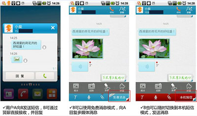 筆者發(fā)現(xiàn),翼聊"超越版"消息對話框界面相比翼聊之前的2.19版有所改變。如下圖,可以看到消息對話框右下角新增了紅色的本機短信按鈕,點擊后,切換到免費消息模式。