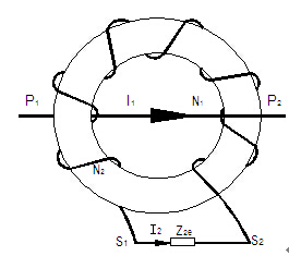 低壓電流互感器的工作原理如圖1所示,電流互感器的一次繞組串聯(lián)在被測(cè)線路中,I1為線路電流即電流互感器的一次電流,N1為電流互感器的一次匝數(shù),I2電流互感器二次電流(通常為5A、1A),N2為電流互感器的二次匝數(shù),Z2e為二次回路設(shè)備及連接導(dǎo)線阻抗。當(dāng)一次電流從電流互感器P1端流進(jìn),P2端出,在二次Z2e接通的情況下,由電磁感應(yīng)原理,電流互感器二次繞組有電流I2從S1流過,經(jīng)Z2e至S2,形成閉合回路。由此可得電流在理想狀態(tài)下I1×N1=I2×N2,所以有I1/I2=N1/N2=K,K為電流互感器的變比。