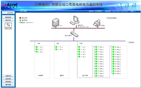 蘇州某金屬制品廠電能管理系統(tǒng)的配電系統(tǒng),10/0.4kV配電系統(tǒng)進(jìn)行用電監(jiān)測(cè)與電能管理;監(jiān)測(cè)范圍為新建變電所的T1、T2變壓器進(jìn)線柜,聯(lián)絡(luò)柜,溫控儀,高壓側(cè)儀表及綜保進(jìn)行遠(yuǎn)程實(shí)時(shí)監(jiān)控和電能管理。該系統(tǒng)總計(jì)有31只儀表(其中包括26只智能電測(cè)儀表ACR220EL,3只中壓保護(hù)裝置AM5,2只溫控儀WHD),分3條總線,都是直接通過(guò)屏蔽雙絞線走管道拉至值班室連接到主機(jī)擴(kuò)展卡上,實(shí)現(xiàn)總線上儀表與監(jiān)控主機(jī)的數(shù)據(jù)連通。