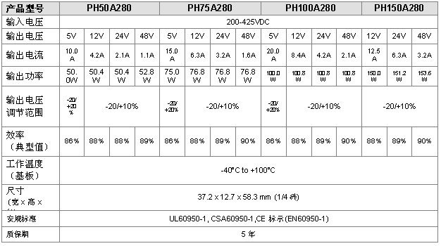 PH-A280系列由非常成功和知名的PH-S280/PH-F280系列而來,尺寸縮小50%,效率提升5%(最高90%)。除了這些重大的改進外,輸入電壓上限也擴展到425VDC.