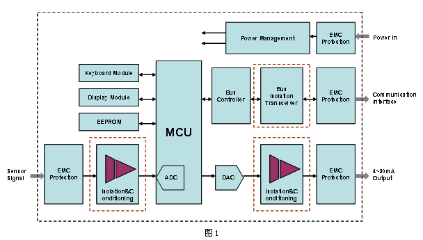 從上圖可以看到,傳感器信號輸入到工業儀表,首先是EMC防護電路,因工業現場的電氣環境復雜,存在強電設備(如大功率電機)、高頻開關設備(如變頻器),這些設備在啟停動作時會產生較大的浪涌及尖峰脈沖,這類的干擾包含比較大的能量,通過EMC防護器件,如壓敏電阻、TVS管等器件吸收這類干擾,保護后級的電路不會因這類干擾造成損壞。傳感器信號經EMC防護電路后輸入到輸入端的隔離放大器進行信號的隔離、調理,信號隔離能保證儀表內部電路與外部傳感器形成地線阻斷,消除共模干擾,從而消除地電位差引起的地線環流,一方面可以確保傳感器信號的采樣精度不受干擾的影響,一方面可以保護內部MCU系統不會因大的共模電壓造成器件的損壞;信號調理,通過信號類型的轉換及信號放大將傳感器信號線性放大成滿足ADC采樣的信號類型及范圍,保證調理后的信號范圍和ADC信號輸入范圍匹配,從而保證ADC采樣精度。MCU將經過ADC數字量化后的傳感器信號進行數字運算,經過數字濾波,線性化運算等一系列的運算后獲得現場物理量的實際狀況,然后輸出到顯示面板,同時將獲得的現場物理量值按照線性比例輸出到DAC電路,DAC電路輸出電壓信號,要想形成4~20mA電流信號,還需要經過輸出端的隔離放大器將電壓信號隔離調理成4~20mA的電流信號輸出。當然信號輸出端也需要設計EMC防護電路。