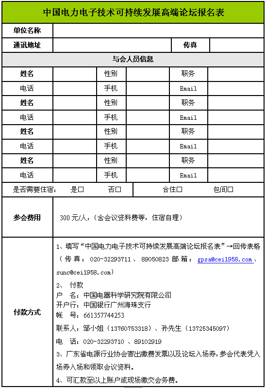 附件1:中國電力電子技術(shù)可持續(xù)發(fā)展高端論壇報名表