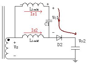 2、電容C1的容值很大,使得C1和漏感Lleak1和Lleak2的諧振周期大于SW1的開關周期。