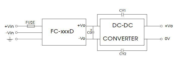 在電路設計方面,由于鐵路電源對可靠性以及EMC要求比較高,而我們電源本身是沒有EMC防護,所以需要在模塊前端設計EMC防護電路,推薦使用FC-CX1D模塊達到更高的EMC等級: