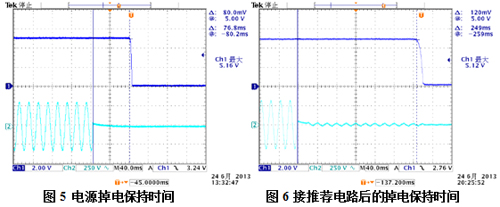 為驗證理論分析和計算的正確性,選取MORNSUN的LH25-10B05來進行測試。在輸入電壓220Vac,負載4A的條件下,LH25-10B05的掉電保持時間為76.8ms,波形如圖5所示;按推薦電路外接100uF/400V輸入濾波電容后,電源的掉電保持時間增加到249ms,波形如圖6所示。試驗結果與理論計算結果吻合。