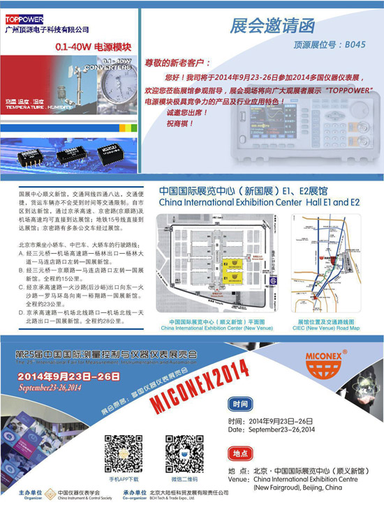 第25屆中國國際測量控制與儀器儀表展覽會”原(多國儀器儀表展覽會) 2014年9月23-26日在北京中國國際展覽中心(新館)舉辦。廣州頂源電子科技有限公司屆時將會展示頂源自主研發的TOPPOWER電源模塊產品。“盛裝”出席這次儀表展,期待新老客戶能到場給與支持。