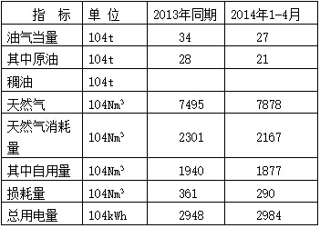 截止到2014年4月底,本單位綜合能耗為3.26×104tce,油氣生產單耗136.78kgce/t,主要生產及能耗數據見表1-1.