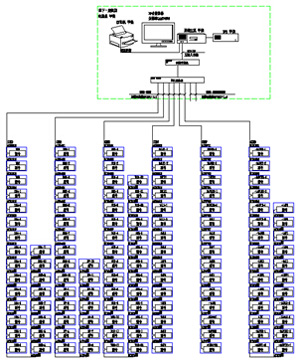 本監控系統主要實現常熟閱山軒假日酒店變電所及樓層配電箱進出線進行用電監控與電能管理;監控范圍為分布于變電所以及樓層各電井配電箱的儀表,對于這些多功能儀表進行遠程實時監控和電能管理。該系統總計有130只儀表(其中兩臺ACR330ELH、71臺PZ80L-E4/KC、17臺PZ96L-E4/C、40臺DTSF1352),分6條總線,接入串口服務器,最后通過TCP\IP網絡接至值班室監控主機,從而實現總線上儀表與監控主機的數據連通。