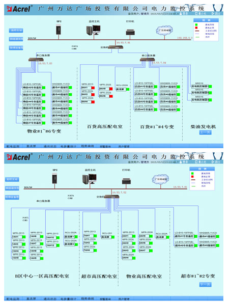 隨著用戶端變配電智能化管理需求的提高,電力監(jiān)控系統(tǒng)的應用已成為發(fā)展趨勢。本文介紹的Acrel-2000電力監(jiān)控系統(tǒng)在廣州萬達廣場項目中的應用,實現(xiàn)了對廣州萬達廣場變配電系統(tǒng)實時監(jiān)控,同時和上層慧云平臺實現(xiàn)數(shù)據(jù)共享。系統(tǒng)對采集數(shù)據(jù)的進行分析、處理,實時顯示各監(jiān)控設(shè)備的運行使用狀況、告警狀態(tài),并生成各種報表、分析曲線、圖形等,便于管理者進行設(shè)備管理和運行維護。該系統(tǒng)運行安全、可靠、穩(wěn)定,為后期電力系統(tǒng)及設(shè)備的維護、制定節(jié)能改造措施提供了科學的依據(jù)。