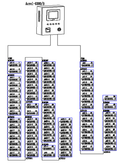 針對以上幾個方面,安科瑞電氣股份有限公司以其自主研發的ARCM系列電氣火災監控探測器為基礎,通過對RS485總線技術、終端微機軟件顯示技術的集成,研發了安科瑞Acrel-6000/B電氣火災監控系統。本系統后臺在顯示各個探測點位數據的同時,還提供越限聲光報警、人性化的界面等功能。本系統實現了配電系統的24小時無人實時監控,減少了人力成本,提高了電氣火災隱患的排除效率。