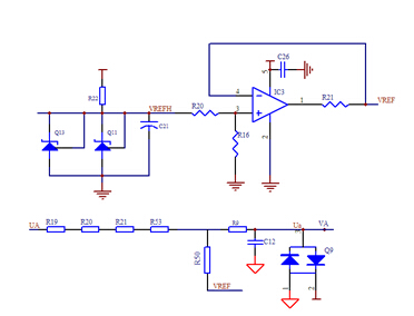 電壓采集電路如圖1所示。三相電壓Ua、Ub、Uc采用電阻降壓的方式,給采樣信號加入抬高電壓VREF,使交流信號的幅值大于零,便于AD采樣。在電路的輸出端,MCU芯片的AD輸入端加入限壓二極管,限制輸入電壓小于(鉗位電壓)3.3V,能對MCU芯片的AD采樣通道起到很好的保護作用。