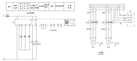 智能水泵控制器,集成了水泵控制需要的電氣元件,包括電壓電流顯示、多功能保護繼電器、手/自動轉換開關、啟/停按鈕、水位和水泵狀態(tài)指示等于一體,面柜式安裝。在給/排水自動模式下,兩泵交替互備,根據(jù)水位不同情況,控制方式支持中水位一臺水泵運行,高(低)水位兩臺水泵同時運行。電流保護支持獨立開/關設置,支持備用泵只報警不脫扣,滿足地下車庫、消防栓等消防場所應用。智能型水泵控制器的二次接線圖如圖3所示。相比于傳統(tǒng)方式,其具有接線簡單,功能強大,后期升級方便等優(yōu)點。