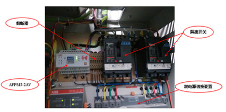 本商場綜合樓項目的AFPM3-2AV三相交流雙電源電壓傳感器安裝于斷路器或隔離開關的輸出端和雙電源切換裝置的輸入端之間,主電源電壓信號接1,2,3,4這四個端子,備用電源電壓信號接5,6,7,8這四個端子,以位于地下室區域的消火栓泵配電箱雙電壓監控為例,傳感器AFPM3-2AV安裝位置示意圖如圖2所示,實物安裝位置圖如圖3所示,電壓信號接線示意圖如圖4所示。