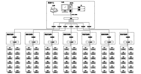 整個系統(tǒng)的監(jiān)控中心位于35kV高壓配電室值班室,數(shù)據(jù)采集主要分為7部分,分別為1#配電室、2#配電室、3#配電室、4#配電室、5#配電室、6#配電室、7#配電室,每個變電所內(nèi)相鄰25塊為數(shù)量上限的儀表連接成一根總線最終連接到變電所內(nèi)的采集箱。所有采集箱均通過光纖及光電轉(zhuǎn)換器連接到,組建成電力監(jiān)控系統(tǒng)專用局域網(wǎng),完成數(shù)據(jù)的傳輸。