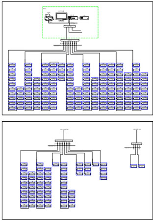 現場變配電所共計196臺低壓智能電力儀表,6臺綜保,4臺變壓器溫度控制器,1臺直流屏,2臺模擬屏;分為20條RS485總線接至變配電所的數據采集器,數據采集器直接通過超五類網線接至值班室的監控主機。