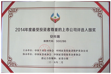 安科瑞榮獲“2014年度最受投資者尊重的上市公司評選入圍獎”