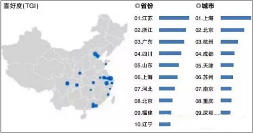 從地區(qū)來(lái)看,江蘇、浙江、廣東三省以及北京、上海等一線(xiàn)市場(chǎng)成為照明產(chǎn)品關(guān)注聚集地,占到38.8%,而四川(5.72%)、河北(4.2%)、河南(3.33%)、安徽(3.51%)、湖南(2.94%)、河南(3.33%)、山西(2.68%)、云南(2.14%)等內(nèi)陸省份成為三四線(xiàn)市場(chǎng)集結(jié)地,占據(jù)35%左右份額