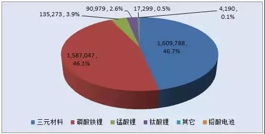 從不同電池類型來看,3.44GWh裝機總電量中磷酸鐵鋰和三元以3.2GWh占比92.8%;錳酸鋰約0.14GWh,占比3.9%;鈦酸鋰90,979KWh,占比2.6%