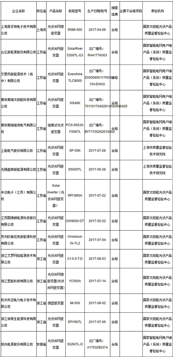 本次共抽查了上海、江蘇、浙江、安徽、廣東等5個省、直轄市27家企業生產的27批次光伏并網逆變器產品。