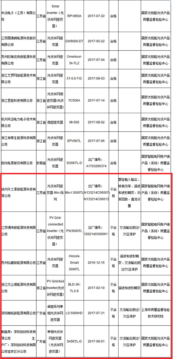 抽查發現有6批次產品不符合標準的規定,涉及到額定輸入輸出、轉換效率、諧波和波形畸變、功率因數、直流分量、交流輸出側過/欠壓保護項目。