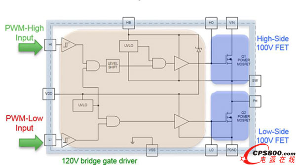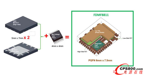 FDMF8811集成了一對(duì)100V的功率MOSFET、120 V驅(qū)動(dòng)器IC和一個(gè)自舉二極管到6.0 mm x 7.5 mm的PQFN封裝。