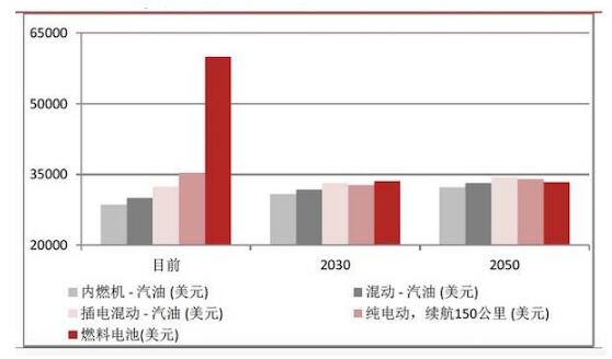 根據市場預計,隨著規模效應與技術優化,燃料電池電堆成本可以從目前380美元/千瓦下降至40-50美元/千瓦甚至更低,2030年燃料電池汽車成本有望接近燃油車水平。
