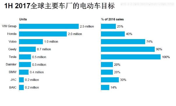 雖然所設定的達標年限不盡相同(2020到2025不等),全球各主流車企均向外公布了各自在近期和中期的電動車銷售目標。