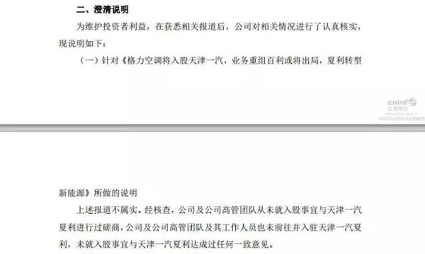 格力電器9月18日宣布停牌并在晚間發布澄清公告,否認格力空調將入股天津一汽夏利。公告稱,“經核查,公司及高管團隊從未就入股事宜與天津一汽夏利進行過磋商,公司及公司高管團隊及其工作人員也從未前往并入駐天津一汽夏利,未就入股事宜與天津一汽夏利達成過任何一致意見。”