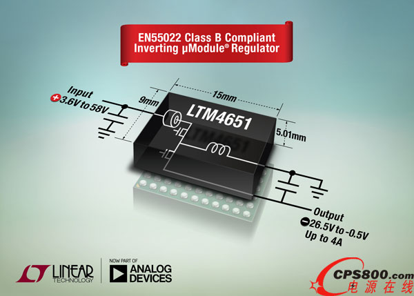 近日, 亞德諾半導體 (Analog Devices, Inc.,簡稱 ADI) 旗下凌力爾特公司 (Linear Technology Corporation) 推出非隔離式負輸出µModule® (微型模塊) 穩壓器 LTM4651,該器件可從正輸入電源電壓產生 –26.5V 至 –0.5V 輸出。LTM4651 在 3.6V 至 58V 輸入電壓范圍內運行,采用 15mm x 9mm x 5.01mm BGA 封裝,是一款緊湊型解決方案,從工業標準 5VIN、12VIN 或 24VIN 電源提供 –5VOUT、–12VOUT、–15VOUT 和 –24VOUT。LTM4651 設計為滿足面向信息技術設備的 EN55022 Class B EMC 標準要求。寬電壓范圍與低 EMI 運行相結合,使該器件非常適合在嚴酷環境中運行的應用,例如測試和測量、工業、工廠自動化、過程控制、醫療設備、成像和通信等。