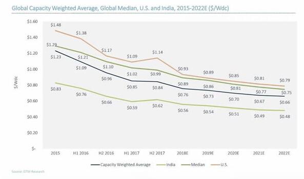 由于供需緊張,2017年下半年美國(guó)大型地面光伏項(xiàng)目的投資成本平均為1.14美元/瓦,比上半年的價(jià)格(1.09美元/瓦)略有上升。同樣,在印度2017年上半年的大型地面光伏項(xiàng)目的價(jià)格為0.62美元/瓦,也超過(guò)了上半年的平均價(jià)格(0.59美元/瓦)。但是放眼2022年,光伏系統(tǒng)成本會(huì)繼續(xù)下降:GTM預(yù)計(jì)美國(guó)的光伏系統(tǒng)投資成本為0.79美元/瓦;印度為0.48美元/瓦,全球加權(quán)平均為0.66美元/瓦。