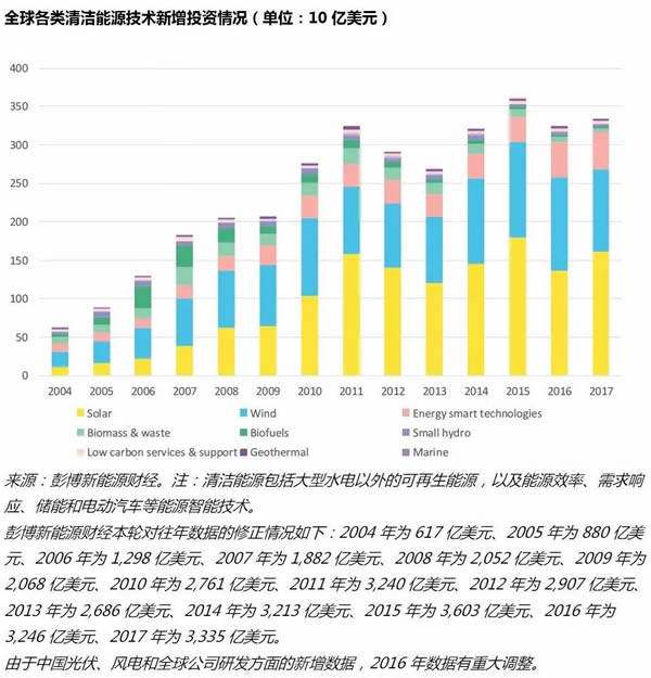 彭博新能源財(cái)經(jīng)擁有世界領(lǐng)先的清潔能源項(xiàng)目與交易數(shù)據(jù)庫(kù),其最新年度數(shù)據(jù)顯示,2017年,全球可再生能源和能源智能技術(shù)的總投資達(dá)3335億美元,較2016年修正后的3246億美元增長(zhǎng)3%,僅與2015年歷史峰值3603億美元有7%的差距。