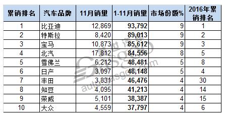 進入2017年,受新能源汽車推廣目錄重審的影響,新能源汽車銷量出現斷崖式下跌,不過隨著補貼政策重新規范調整以及市場需求逐步回歸正常,今年新能源汽車產銷呈現頑強走強的特征。中汽協數據顯示,2017年11月,新能源汽車銷量11.9萬輛,同比增長83%,月度產銷量創歷史新高,并且實現10個月的月度連續環比增量;1-11月,新能源汽車銷量60.9萬輛,同比增長51.4%。