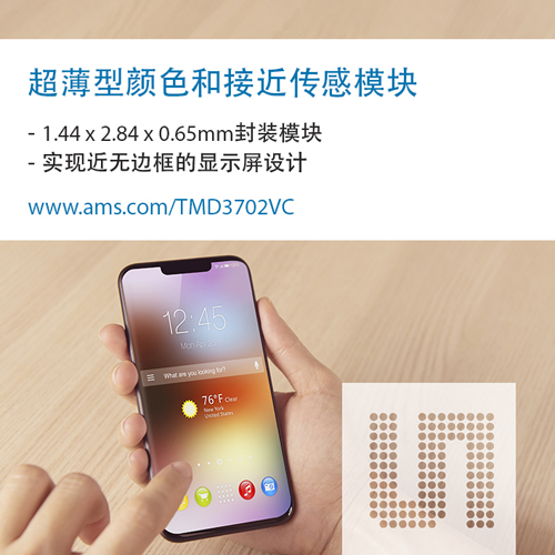 艾邁斯半導(dǎo)體新推出的TMD3702VC三合一集成模塊采用1.44mmx2.84mmx0.65mm封裝。智能手機(jī)制造商可用它代替之前尺寸更寬的模塊,實(shí)施窄邊框設(shè)計(jì),增大顯示屏區(qū)域與機(jī)身尺寸之間的比例,同時(shí)保持重要的紅外接近和光感應(yīng)功能。