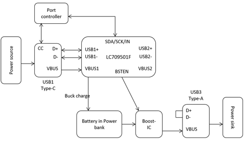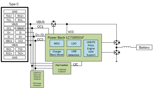 為了支持PD的所有功能,包括使用VDM的快速充電,移動電源制造商將需要轉向設計一個智能控制器來提供通過USBPD提供的功能。例如安森美半導體的LC709501F。這高度集成的基于Flash的可配置設備匯集了所需的所有功能,通過多個USB接口管理鋰離子電池提供的電源。圖2所示為一個典型的應用示例。