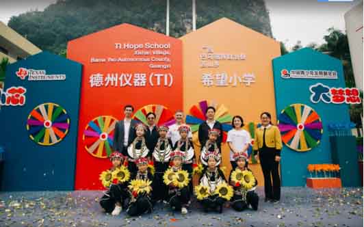 全球領先的模擬與嵌入式處理領導廠商德州儀器(TI)捐建的“廣西巴馬瑤族自治縣西山鄉德州儀器(TI)希望小學”日前于當地舉行正式啟用儀式。這也是TI在中國捐建的第六所“德州儀器(TI)希望小學”。TI全球教育技術總裁、教育事業及企業社會責任副總裁PeterBalyta博士、TI全球副總裁暨中國區總裁胡煜華女士、TI亞洲區市場傳播總監樂大橋先生、TI亞洲區企業傳播及公益事務總監沈之渙女士以及二十余位來自TI各部門的經理和員工志愿者們共同參加了啟用儀式,并為希望小學的孩子們帶來了“TI魔力芯動課堂”、趣味英語課和趣味運動會等活動。中國青少年發展基金會常務副秘書長楊曉禹先生、共青團廣西區委副巡視員吳宗勛先生、共青團河池市委書記張秋文先生及巴馬縣共青團和政府的領導嘉賓,以及媒體代表出席了本次活動。