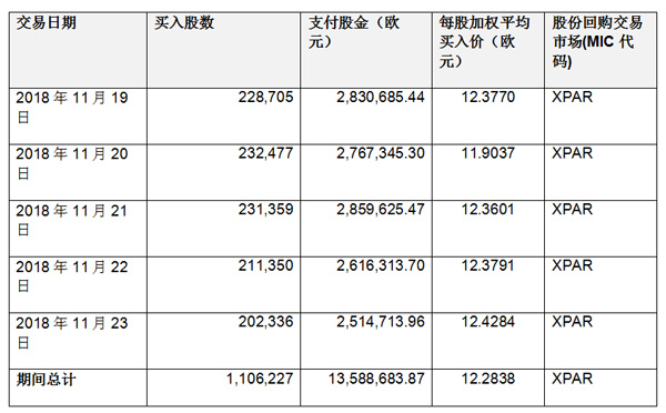 意法半導體(工商登記號:33194537)(法人識別碼:213800Z8NOHIKRI42W10)(股票代碼:“STM”)宣布,在2018年11月19日至2018年11月23日期間(“期間”),在巴黎泛歐證券交易所監管市場上,以每股12.2838歐元加權平均價,(委托經紀人)回購1,106,227股普通股(占公司已發行股本0.1%),總價13,588,683.87歐元。