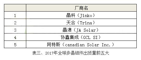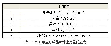 若是以單晶組件出貨排名來看;我們可以明顯看到單晶硅片龍頭大廠隆基樂葉一舉躍升為首位,主要原因在于該廠為專注于單晶產品的生產制造;舉凡從上游的硅片、中間的電池到組件出貨,皆是以單晶作為品牌著稱,預期2018年會有超過倍數成長的實力。