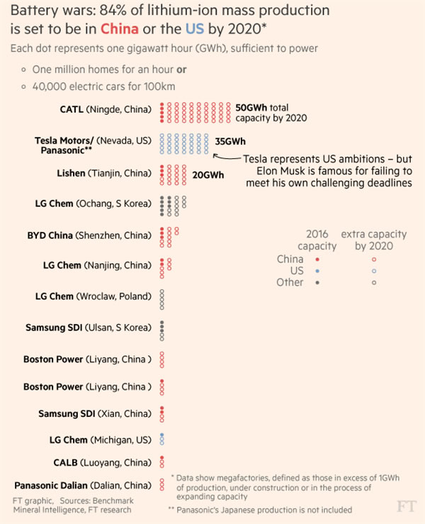 根據彭博新能源財經(Bloomberg New Energy Finance)的數據,如果中國電池企業能實現目標,到2020年,它們將有能力生產121GW的電池。
