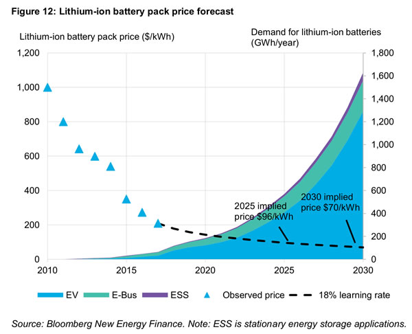 BNEF預(yù)測,2025年鋰電池組的平均成本可降至96美元/千瓦時;2030年將至70美元/千瓦時。到2030年,全球?qū)︿囯姵亟M的需求可達(dá)16億千瓦時,其中80%將用于電動汽車,其余主要用于電動大巴車。