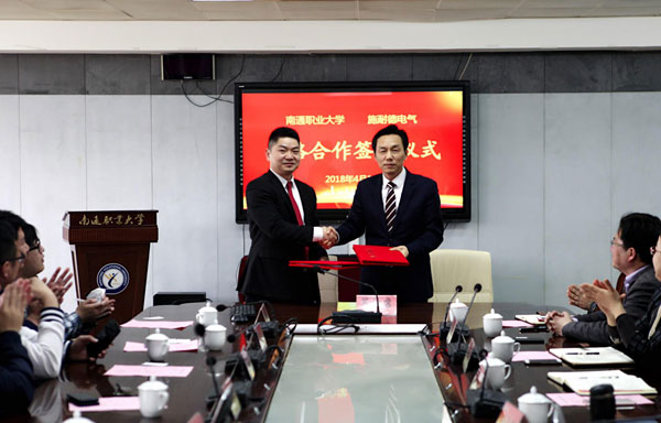 施耐德電氣工業事業部戰略和業務發展部經理陳斌與南通職業大學校長馬成榮代表雙方簽約