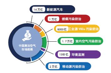 《展望》預測了六個具有較大發展潛力的清潔技術領域的市場發展機遇。包括:燃煤污染治理、工業源VOCs污染防治、環境監測、移動源污染防治、新能源汽車,以及室內空氣污染防治。初步估算,六個重點行業或將實現超過20萬億的市場增長。新能源是市場規模最大的領域。