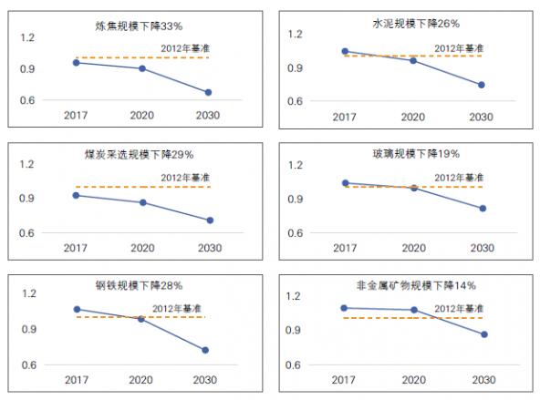 到2030年,煉焦、煤炭采選、鋼鐵、水泥行業2030年生產規模與2012年相比分別下降約30%。玻璃行業、其他非金屬礦物制品行業生產規模分別下降了17%和14%。精煉石油、化學工業、有色金屬等調控行業的生產規模增長受到一定的限制。