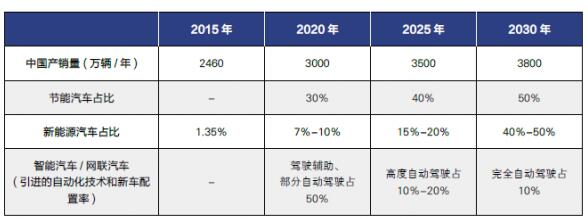 2015-2030年的節能汽車、新能源汽車、智能汽車、網聯汽車數量普及及路線圖