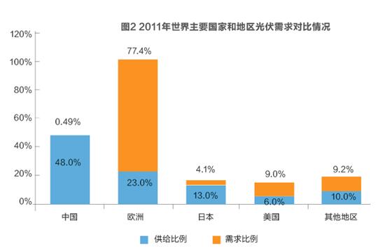 2012年左右,中國(guó)光伏產(chǎn)業(yè)仍處于發(fā)展起步階段。在設(shè)備制造方面,太陽(yáng)能電池生產(chǎn)的關(guān)鍵設(shè)備大多來(lái)自國(guó)外供應(yīng)商,僅此項(xiàng)成本便占據(jù)企業(yè)總成本的80%;在晶硅提煉方面,國(guó)內(nèi)晶硅板制造企業(yè)普遍缺乏最核心的晶硅提煉技術(shù),硅錠主要依賴美國(guó)進(jìn)口,國(guó)內(nèi)企業(yè)僅扮演來(lái)料加工的角色,附加值極低;在市場(chǎng)開(kāi)發(fā)方面,中國(guó)光伏企業(yè)嚴(yán)重依賴出口,2011年,我國(guó)太陽(yáng)能電池供給比例高達(dá)48%,而國(guó)內(nèi)對(duì)太陽(yáng)能電池需求占比僅為0.4% (見(jiàn)圖2)。普遍缺乏核心技術(shù)、嚴(yán)重依賴國(guó)外市場(chǎng)、“兩頭在外、受制于外”的畸形發(fā)展模式,嚴(yán)重掣肘中國(guó)光伏產(chǎn)業(yè)的持續(xù)發(fā)展。海外市場(chǎng)的變化,更是成為了中國(guó)光伏企業(yè)的命門(mén)所在。