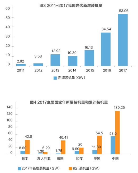 在政策指引下,國(guó)內(nèi)光伏裝機(jī)總量逐年攀升(圖3),2017年我國(guó)光伏累計(jì)裝機(jī)量已經(jīng)達(dá)到130.25GW,新增裝機(jī)量達(dá)到53.06GW,占全球新增裝機(jī)量的54%左右,均處于世界領(lǐng)先地位(圖4)。
